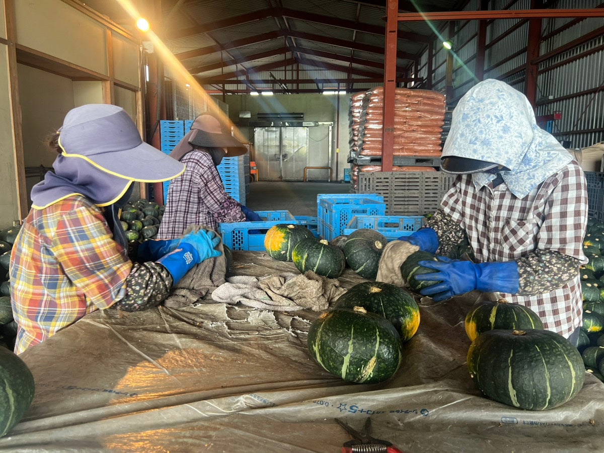 今回ご協力いただいたかぼちゃ農家の一つ、熊本県熊本市「北部農園」。効率化を高めるために他ではほとんどやっていない年3期作を実現しており、青果で取り扱えない基準は工場や加工に回し「規格外」としてなるべくロスが出ないように努力されています。